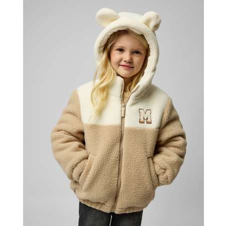 Укороченная плюшевая куртка для девочки Futurino Cool в бежевом цвете, с ушками на капюшоне.