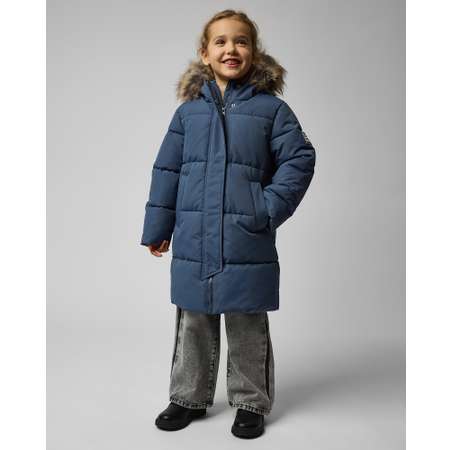 Стёганое зимнее пальто для девочки Futurino синего цвета. Декорировано нашивкой.