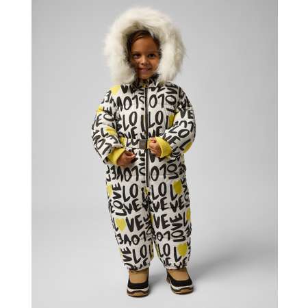 Зимний комбинезон для девочки Baby Go Trend, декорированный контрастным принтом с надписями. Дополнен эластичным съёмным ремешком.