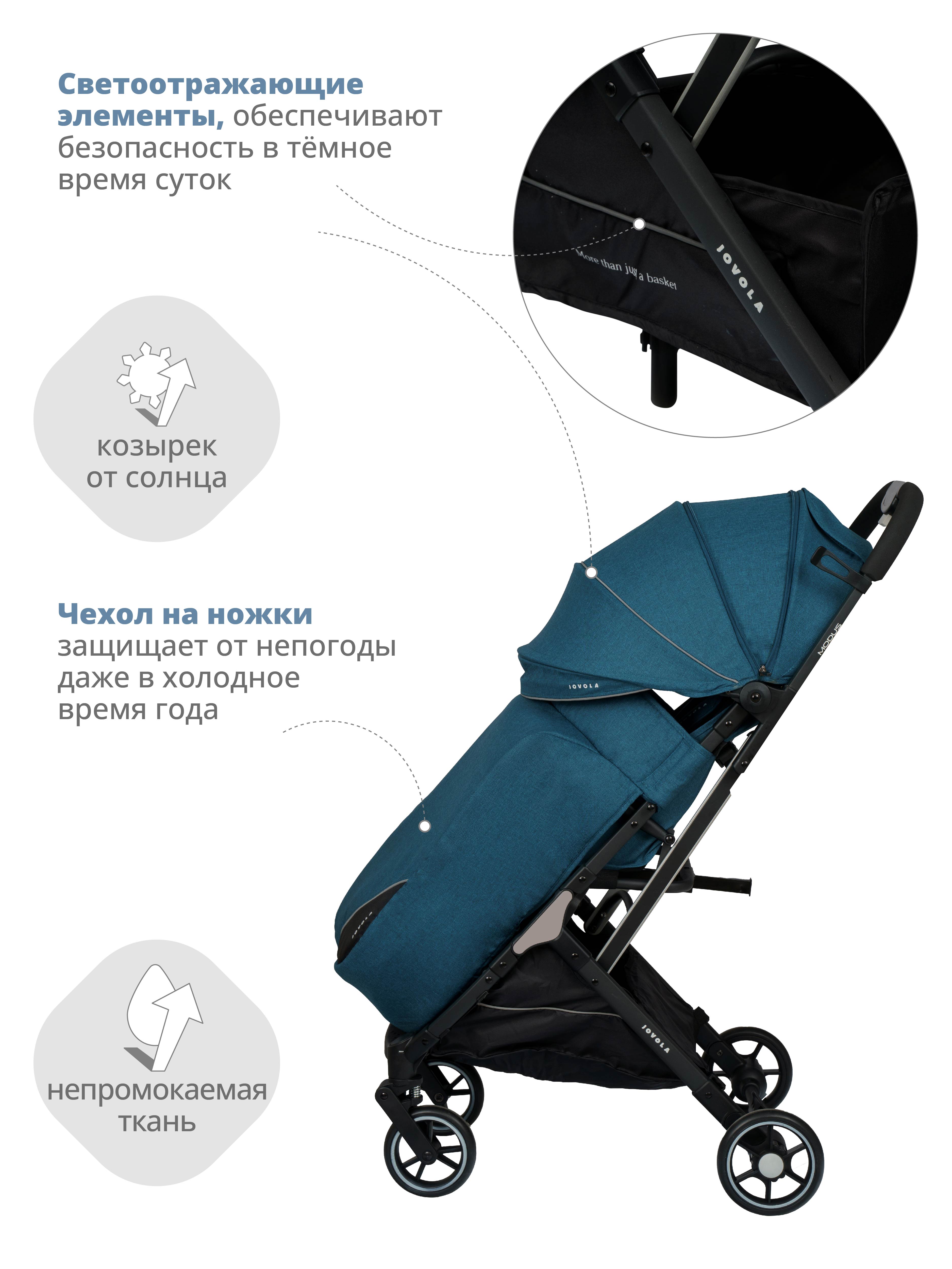 Легкая, детская прогулочная коляска Jovola MODUS- незаменимая помощница в путешествиях и просто на прогулках с детьми от 6 месяцев до трех лет! Выдерживает нагрузку до 15 кг. Вес самой коляски чуть более 7 кг. Ее преимуществом является возможность компактно складываться как чемодан с ручкой для транспортировки. Тип складывания - книжка. В таком виде ее очень удобно перевозить в любом транспорте. Колеса из мягкого материала EVA, диаметром 15 см обеспечивают коляске-прогулке мягкость хода. Они не нуждаются в подкачивании и не боятся проколов. Передние поворотные. Амортизация пружинная, удобный центральный тормоз. Сиденье прогулочного блока мягкое, стеганное. Спинка регулируется вплоть до положения лежа, также как и подножка. Пятиточечные ремни безопасности с мягкими накладками регулируются по высоте. Бампер съемный. Внешний чехол коляски для детей из водоотталкивающей, не продуваемой ткани. Если одевать малыша по погоде, она может использоваться как всесезонная, круглый год. Для прогулок зимой и в прохладную погоду в комплекте утепленная накидка на ножки ребенка. Чехол для ног надежно крепится к бамперу с помощью кнопки. Для багажа и покупок предусмотрена открытая корзина. Недорогие, прогулочные летние коляски для путешествий MODUS изготавливаются в универсальных цветах, для мальчика и девочки.Цены в интернет-магазине могут отличаться от розничных магазинов.