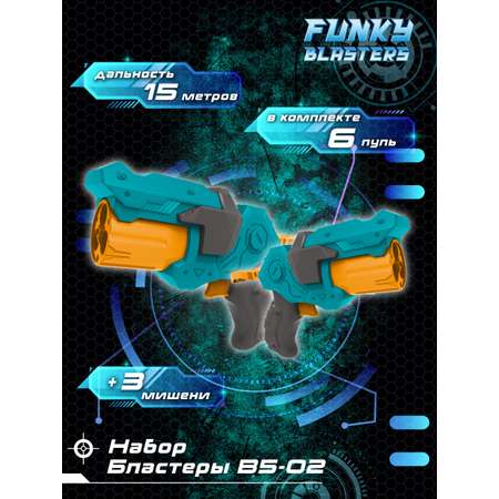 Приготовьтесь к фантастическим битвам с помощью двух новых стильных и функциональных бластеров от Funky Toys! Это идеальный выбор для любителей активных, сюжетно-ролевых и командных игр. Великолепная дальность стрельбы на 12-15 метров дает возможность проводить захватывающие игры где угодно: на открытом воздухе или в помещении. Маленькие бойцы смогут протестировать свои навыки и улучшить координацию движений, а также развить воображение! Игрушка подойдет для детей от 3 до 10 лет. В комплекте 2 бластера, 6 цветных мягких пуль и 3 стилизованные мишени. Патроны выполнены из мягкого материала и не навредят ребёнку. Важной особенностью является детальная проработка игрушечного пистолета: в конструкции предусмотрен спусковой крючок и съемная обойма. Чтобы начать перестрелку, вставьте патроны в обойму, зарядите оружие, выставите мишени, нажмите на спусковой крючок и стреляйте! Сочетание качественных прочных материалов и стильного дизайна сделает этот бластер фаворитом всех любителей воздушного оружия. А презентабельная подарочная упаковка сделает его идеальным подарком на Новый год, день рождения или другой праздник! Соберите весь арсенал Funky Blasters и устраивайте невероятные битвы! Не упустите возможность подарить ребенку увлекательное и безопасное развлечение!оберите весь арсенал Funky Blasters и устраивайте фантастические битвы! вместе с Funky Blasters!