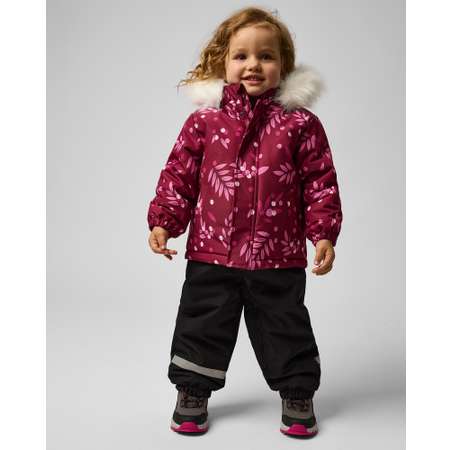 Зимний комплект для девочки Baby Go из дух предметов: чёрного полукомбинезона и бордовой куртки с растительным принтом.