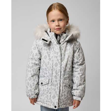 Зимний комплект для девочки Futurino из двух предметов: куртки с леопардовым принтом и светло-серых брюк на бретелях.