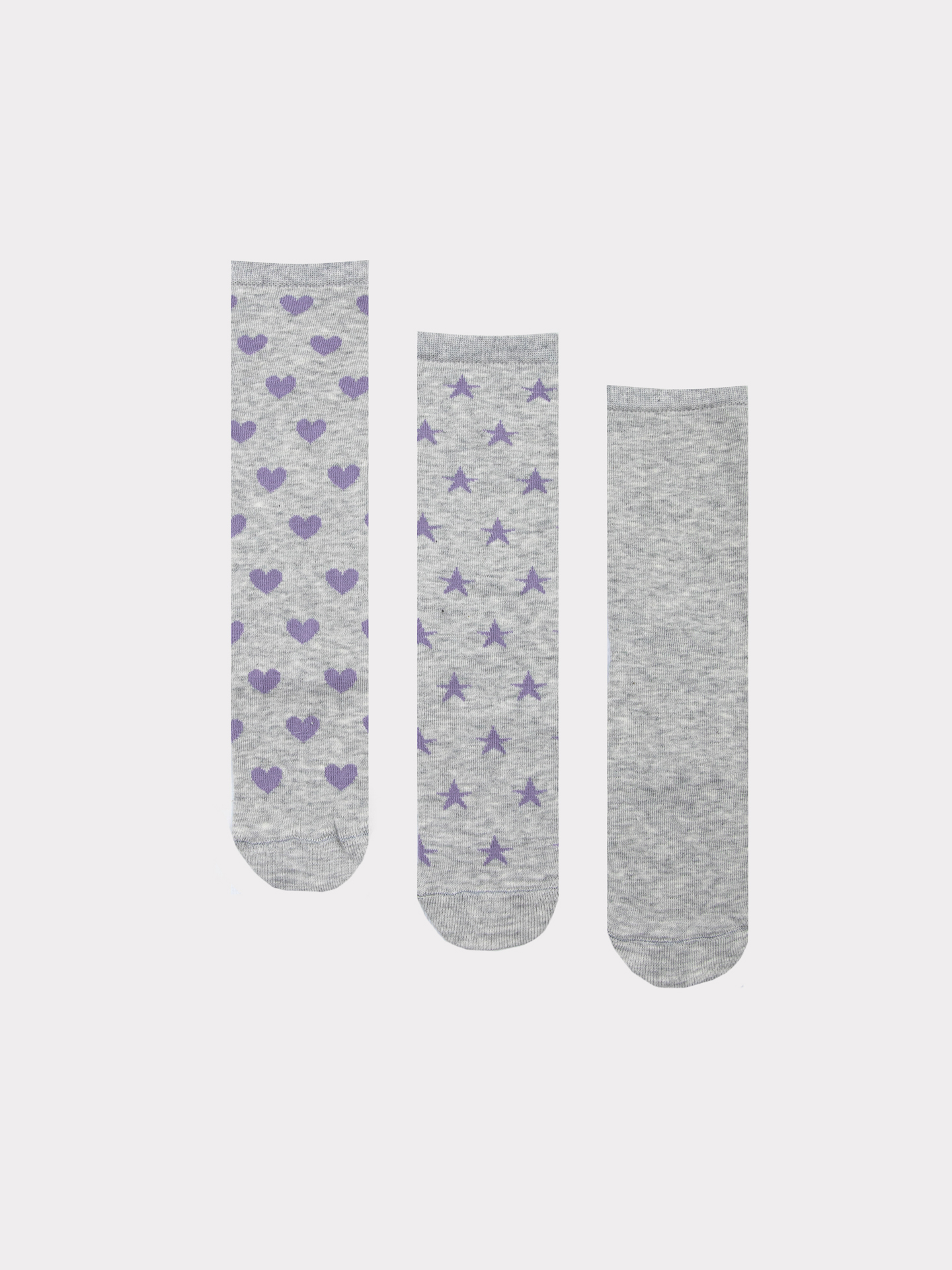 Высокие носки для девочки мультипак (3 пары) серые с рисунком в виде лавандовых сердец и звёздочек из высококачественного хлопка. Натуральные волокна отлично пропускают воздух и впитывают влагу, дарят ощущение комфорта в течение дня. Благодаря небольшому количеству эластана в составе, высокие детские носки удобно сидят и не сползают, хорошо тянутся и легко надеваются. Пятка и мысок дополнительно укреплены для защиты от протирания. Резинка мягко, но надежно удерживает носки, не оставляя на коже следов. В ассортименте Mark Formelle можно выбрать самые разнообразные дизайны и расцветки: однотонные зеленые, желтые, синие или серые детские носки подойдут и для мальчика, и для девочек, найдутся модели в полоску, с оригинальными авторскими рисунками, орнаментами, а также базовые носки белые и черные детские. Маленьким модникам точно понравятся!