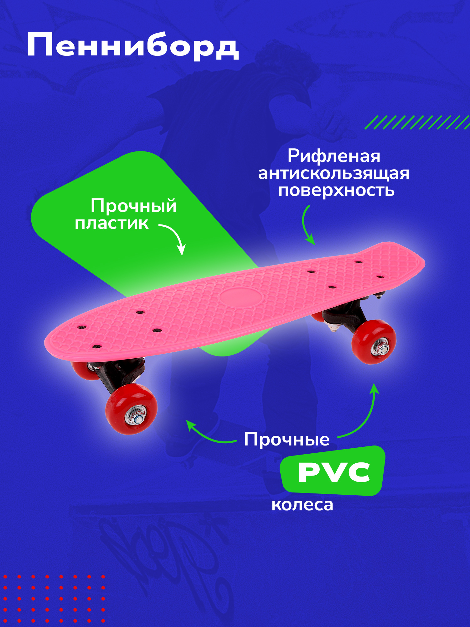 Скейтборд Пенниборд пластиковый Наша игрушка для детей — это не просто игрушка, а настоящее средство передвижения и способ самовыражения для любителей активного образа жизни.Скейтбординг – это не только весёлый досуг! Это настоящее спортивное увлечение, занятие которым поспособствует развитию всех групп мышц и улучшению координации движений. Осваивая скейтборд, ребёнок может начать с простого катания, а потом, постепенно, осваивать различные трюки, от простых к сложным. Таким образом, каждое занятие скейтбордингом будет сопровождаться всё новыми и новыми спортивными достижениями!Модель пенни борда от торговой марки Наша игрушка отличается не только привлекательным дизайном, но и высокой практичностью благодаря анодированной деке. Анодирование представляет собой процесс создания оксидной плёнки, которая повышает стойкость поверхности изделия к износу и, соответственно, существенно увеличивает его срок службы.Скейтборды подходят для начинающих райдеров и любителей активного отдыха. Лонгборды идеально подойдут как для мальчиков, так и для девочек, которые хотят освоить основы катания на скейтборде или усовершенствовать свои навыки. Скейтбордист любого уровня подготовки сможет оценить его преимущества.Наш скейтборд пенни борд изготовлен из качественных материалов, обеспечивающих прочность и долговечность конструкции. Он оснащен надежными колесами, которые обеспечивают отличное сцепление с поверхностью и позволяют выполнять различные трюки и маневры. Благодаря своему компактному размеру, скейт легко брать с собой в поездки и хранить дома.Этот скейтборд подойдет для детей и подростков, которые только начинают свой путь в мире скейтбординга. Однако он также может быть интересен и более опытным райдерам, ищущим надежный и доступный вариант для тренировок и развлечений. Характеристики:Скейтборд выполнен из крепкого пластика;Подходит для детей и взрослых.Колёса выполнены из износостойкого PU 5,6 см.;Подвеска из алюминия;Подшипники АВЕС 7;Размер платформы (ДхШ): 41х12 см;Максимальная нагрузка: 30 кг;Рекомендованный возраст: 5 лет+