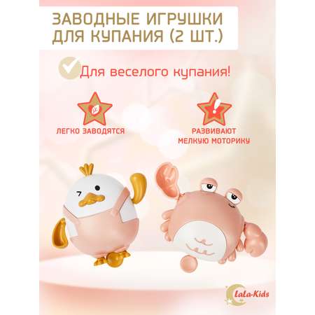 Заводные игрушки LaLa-Kids превратят купание малыша в веселую игру! Игрушки для ванной (веселый краб и уточка для ванны) имеют простой и надежный заводной механизм. Наши заводные игрушки для малышей не требуют батареек. Игрушки для купания плавают, вращая лапками, и веселят малыша!