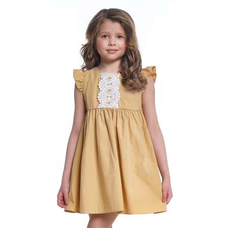 Платье для девочки (бежевое) Выполнено из 100% хлопкового текстиля без принта. Отрезное по талии с защипами книзу, короткий рукав мини-крылышко, объемная юбка, округлая горловина. Нарядное, комфортное. Несквозная застежка на спинке (пуговицы). Декорировано белой кружевной вертикальной накладкой от горловины до линии пояса.