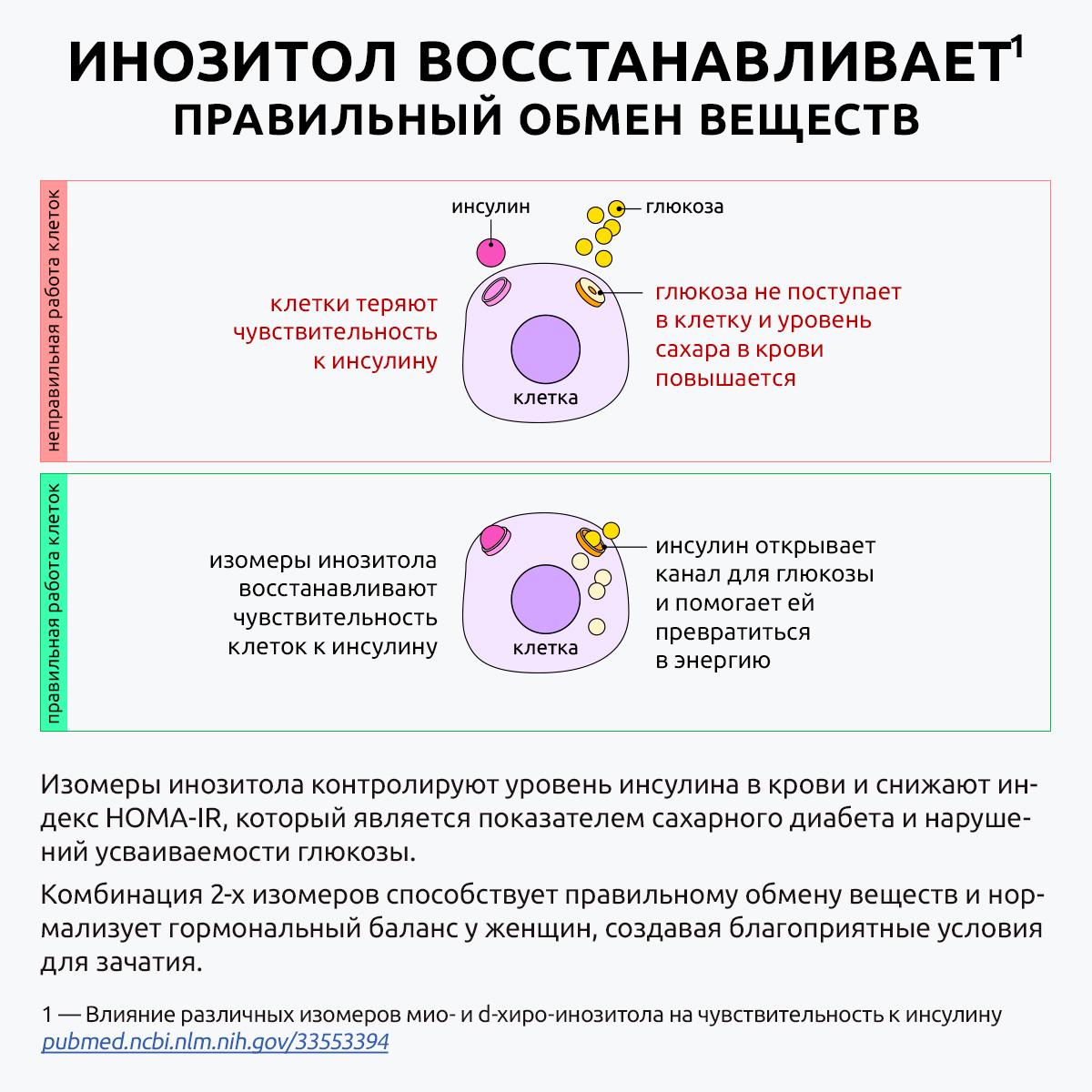 Inositol Ultra balance воздействует на инсулин, обеспечивая правильную переработку глюкозы в энергию, способствует восстановлению обмена веществ. Изомеры инозитола контролируют уровень инсулина в крови и снижают индекс HOMA-IR, который является показателем сахарного диабета и нарушений усваиваемости глюкозы, восстанавливает баланс инозитола в плазме крови и корректирует метаболические нарушения, повышая чувствительность клеток к инсулину, необходимого для полноценной переработки глюкозы в энергию. Инозитол корректирует метаболический профиль организма и борется с ожирением, в том числе с жировой болезнью печени. При инсулинорезистентности образуется дефицит фермента изомера эпимеразы и нарушается естественный синтез изомеров инозитола MYO в DHI.