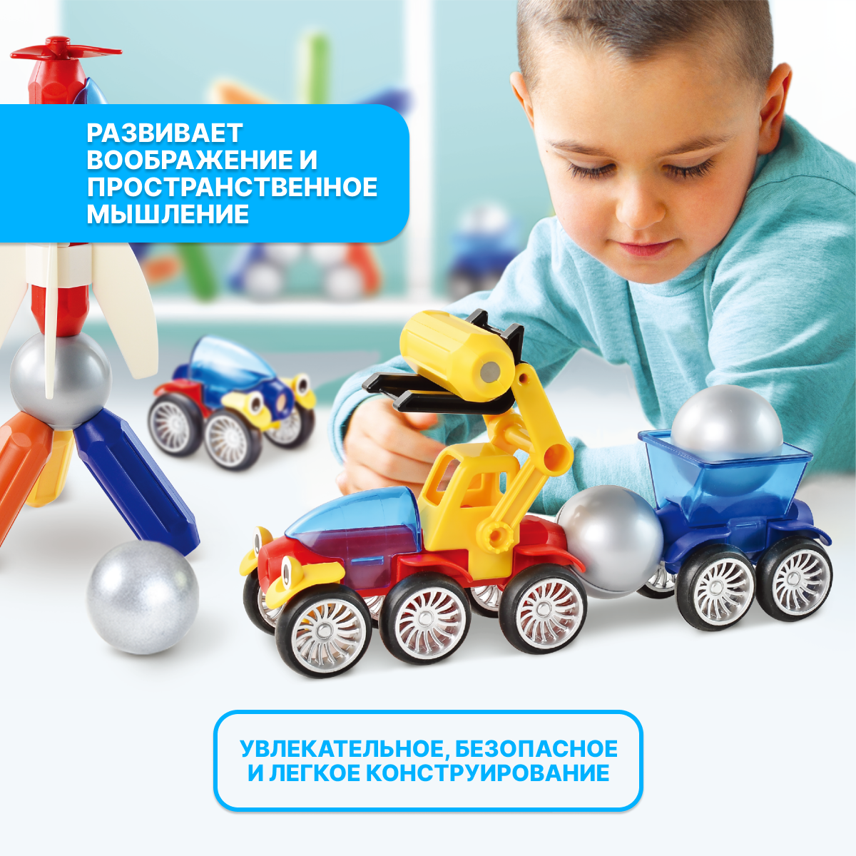 Этот магнитный 3д конструктор — настоящий праздник для ребенка! Из 30 деталей можно собрать машину, грузовик, бульдозер, экскаватор или погрузчик — кто сказал, что только взрослые знают толк в автопарке? А если фантазия разыгралась не на шутку — соедините машинки между собой, чтобы построить целый автопоезд!