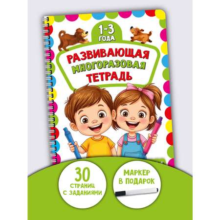 Многоразовая тетрадь Развивашка для малышей Напиши и сотри увлечет надолго Вашего малыша. Здесь мы собрали разнообразные и самые интересные задания, грамотно составили их, расположив от простого к сложному с учётом возрастных особенностей детей. Развивашка рассчитана на 2 3 года и включает в себя 30 заданий на разные темы для изучения и развития. Книжка состоит из 34 страниц со специальным защитным покрытием. Благодаря большому размеру А4 в детской книге удобно рисовать и писать и она отлично подходит как игры в дорогу. Тетради пиши стирай позволят вам легко и в игровой форме потренировать логику, внимательность, усидчивость и помочь в развитии речи, а также это прекрасный способ провести время с пользой, улучшить мелкую моторику рук, зрительное восприятие, внимание и память. Детская книга хорошо удерживает внимание детишек, отвлекая их от мультфильмов, позволяя увлечь занятиями. Большая книга игр и заданий позволит Вам качественно проводить время с малышом, ведь с такими пособиями вы сможете включиться в творческое развитие, воспитание и обучение ребёнка, начиная с детского сада и до подготовки к школе. А как многоразовые прописи для дошкольников, наши альбомы станут первым тренажером для подготовки руки и обучению письму. Упражнения сделаны простыми и понятными, сделав их один раз он скажет: теперь я могу решать всё сам, а у мамы появится время отдохнуть. А уникальная возможность стирать ошибки и учиться рисовать заново, решая все упражнения правильно. Красочный и яркий дизайн журналов создает процесс обучения, воспитания и развития ребёнка более увлекательным и результативным. Такая многоразовая тетрадь будет интересна и как развивающие игры для детей на 2 3 года, и как первая энциклопедия для детей 2 3 лет. Говорите Вашему малышу каждый день: Пиши и стирай