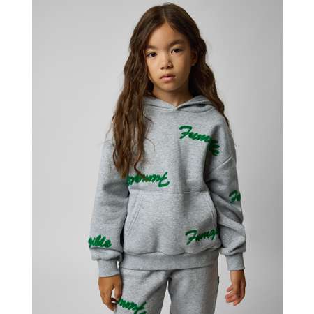 Серое меланжевое худи для девочки Futurino, декорированное вышивкой с надписями.
