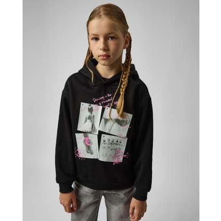 Худи для девочки Futurino чёрного цвета, декорированное блестящим принтом с надписями и изображениями в балетной тематике.