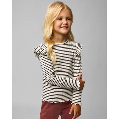 Белый лонгслив для девочки Futurino в полоску, декорированный оборками и волнистым кантом.