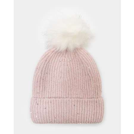 Розовая шапка для девочки Futurino с помпоном из искусственного меха. Декорирована люрексом и пайетками.