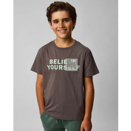Серая футболка для мальчика Futurino, декорированная принтом-надписью с объёмным элементом.