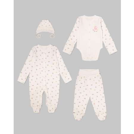 Подарочный набор на выписку «Моя Горошинка» из четырёх предметов для девочки: комбинезона, боди, ползунков и чепчика на завязках. Изделия декорированы нежным цветочным принтом, выполнены из 100% хлопка.