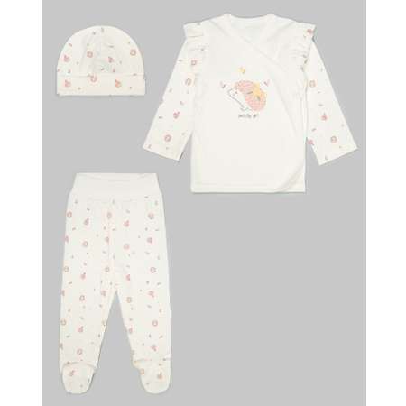 Комплект для девочки "Моя Горошинка" из трёх предметов: распашонки с оборками, ползунков и шапочки с отворотом. Изделия декорированы очаровательным принтом с ёжиками, выполнены из 100% хлопка.