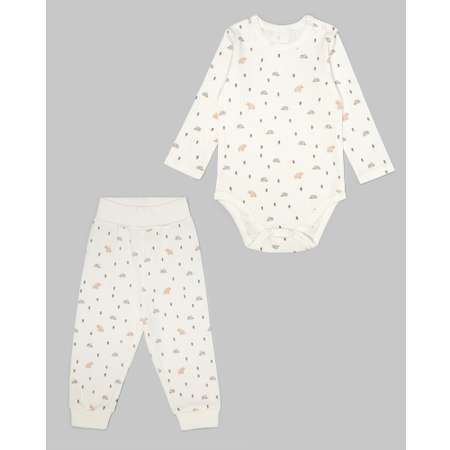 Комплект для мальчика "Моя Горошинка" молочного цвета в рубчик из боди и брюк с цветным принтом.