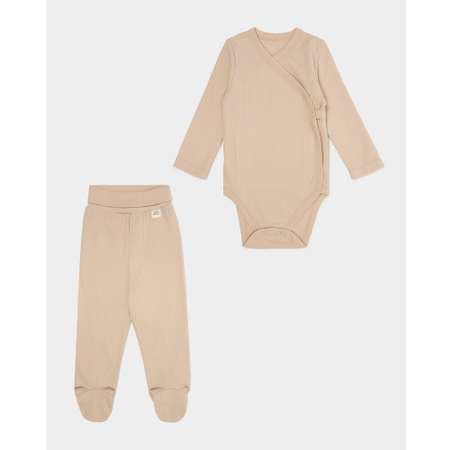 Однотонный комплект для мальчика "Моя Горошинка" бежевого цвета в рубчик. Состоит из боди и ползунков с нашивкой.