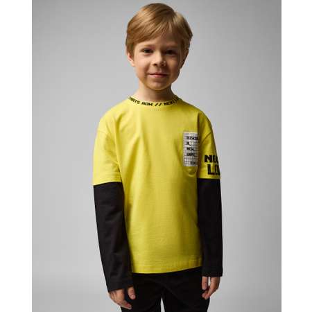 Жёлтый лонгслив для мальчика Futurino с контрастными рукавами. Декорирован принтом в стиле компьютерных игр.