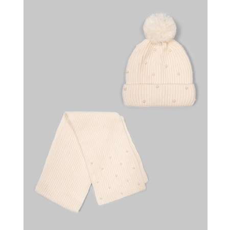Зимний комплект для девочки Futurino из шарфа и шапки с помпоном из искусственного меха. Изделия декорированы жемчужными бусинами.