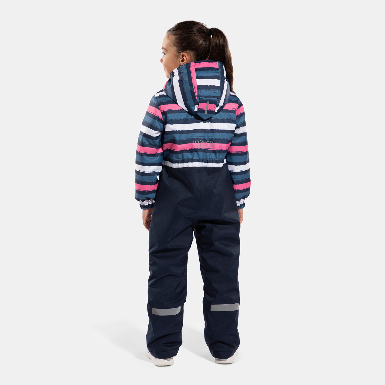 Комбинезон выполнен из ткани с мембраной 5000/5000 и специальным грязеотталкивающим покрытием. Мембрана надежно защищает от ветра и не промокает, но при этом дает телу дышать. Благодаря современному утеплителю Shelter 100 гр/м2отлично сохраняет тепло, быстро сохнет и не деформируется даже при частых стирках. Центральная застежка и карманы на молнии, внутренняя ветрозащитная планка. Защита подбородка. Съемный капюшон с регулировкой по глубине. Подкладка капюшона, стойки воротника, манжет, спинки и полочки выполнены из флиса. Регулировка манжет липучкой. Внутренняя регулировка на талии для создания силуэта, внутренние бретели для возможности снять верхнюю часть изделия в помещении. Силиконовые съёмные штрипки и манжеты на брючинах усиливают фиксацию и защищают от попадания влаги внутрь обуви. Светоотражающие элементы повышают видимость ребенка в темное время суток.