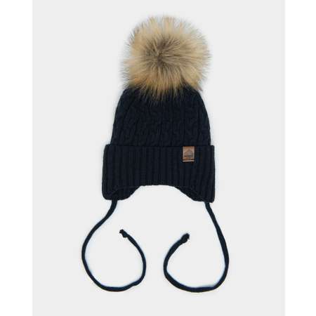 Утеплённая тёмно-синяя шапка для мальчика Futurino Cool с помпоном из искусственного меха. Декорирована нашивкой.