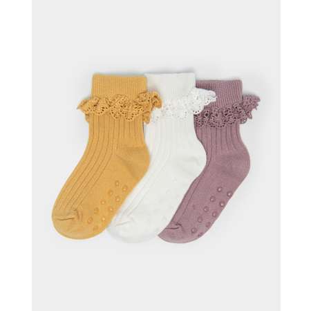 В комплекте Baby Gо три пары однотонных носков для девочки с кружевными оборками - горчичные, белые и фиолетовые.