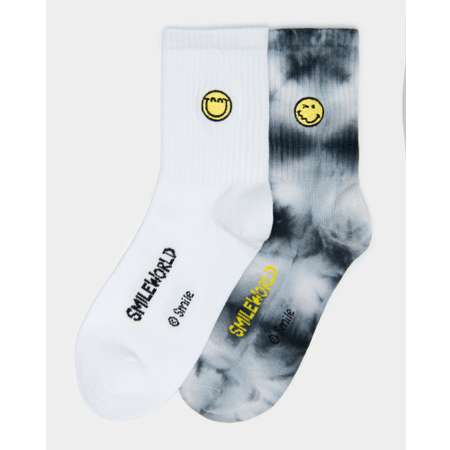 В комплекте Futurino две пары носков для мальчика - белые и с принтом "тай-дай" в сером цвете. Декорированы вышивкой в виде смайликов.