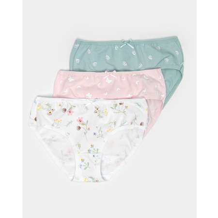 В комплекте Day and Night три модели трусов для девочки - белые и зелёные с цветочным принтом, и розовые с бабочками. Декорированы бантиком.