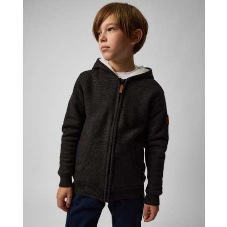Утеплённая вязаная толстовка для мальчика Futurino тёмно-серого цвета. Декорирована нашивкой.