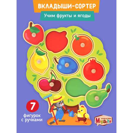 Этот деревянный сортер с яркими вкладышами поможет малышу весело провести время, развивая важные навыки. В комплект входят 7 деталей в виде фруктов: вишни, лимона, груши, сливы, яблока, апельсина и граната. Каждое углубление на игровой рамке основании имеет цветовое соответствие подходящему фрукту, что упрощает процесс игры.