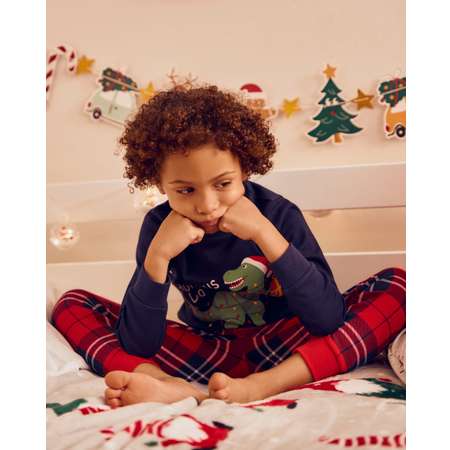 Новогодняя пижама для мальчика Futurino из брюк в клетку и лонгслива, декорированного принтом с Т-рэксом.