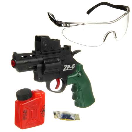В комплекте пистолет, элемент для засыпания пулек, очки, контейнер для пулек, пакетик, где 500 шариков.