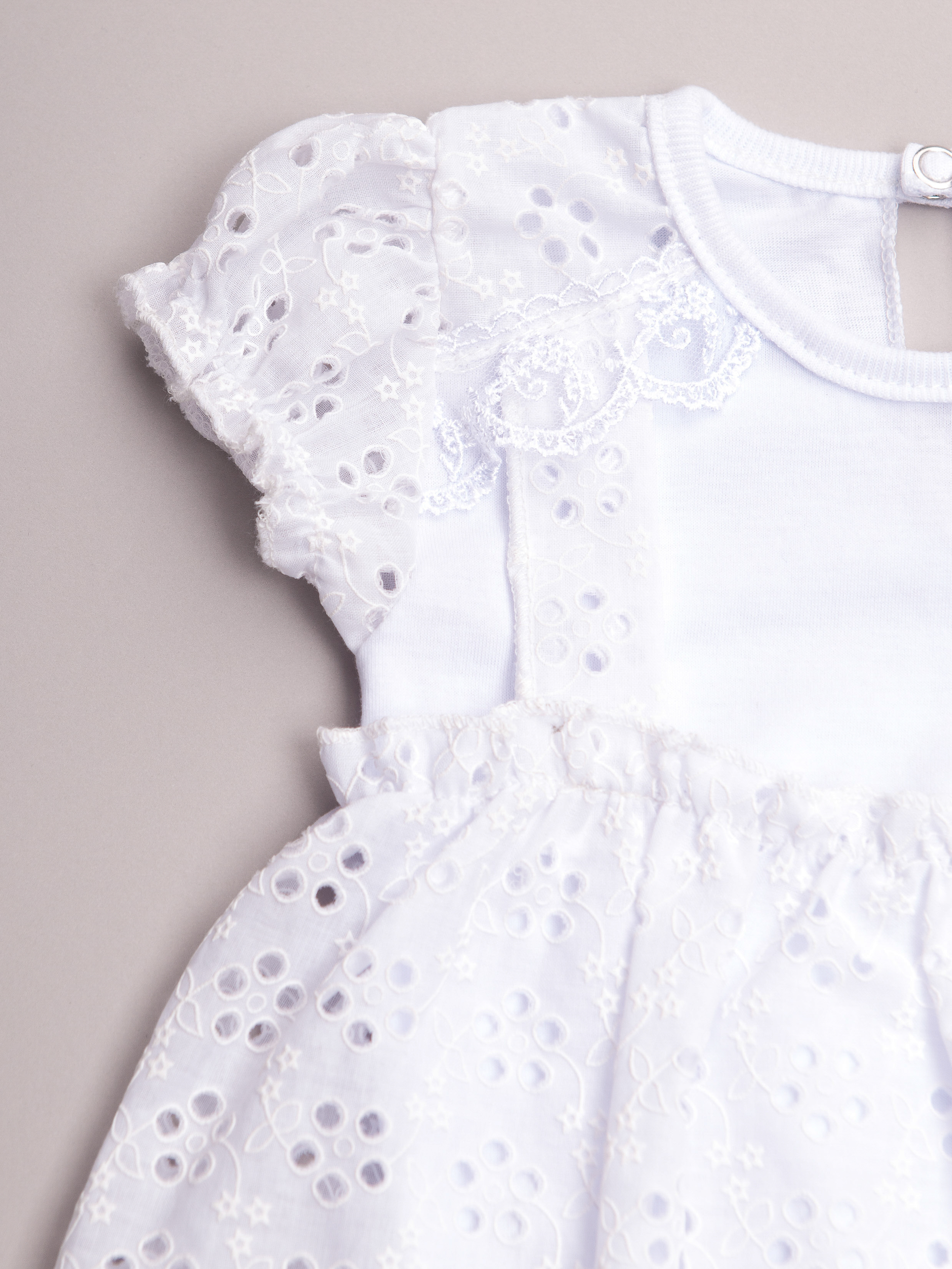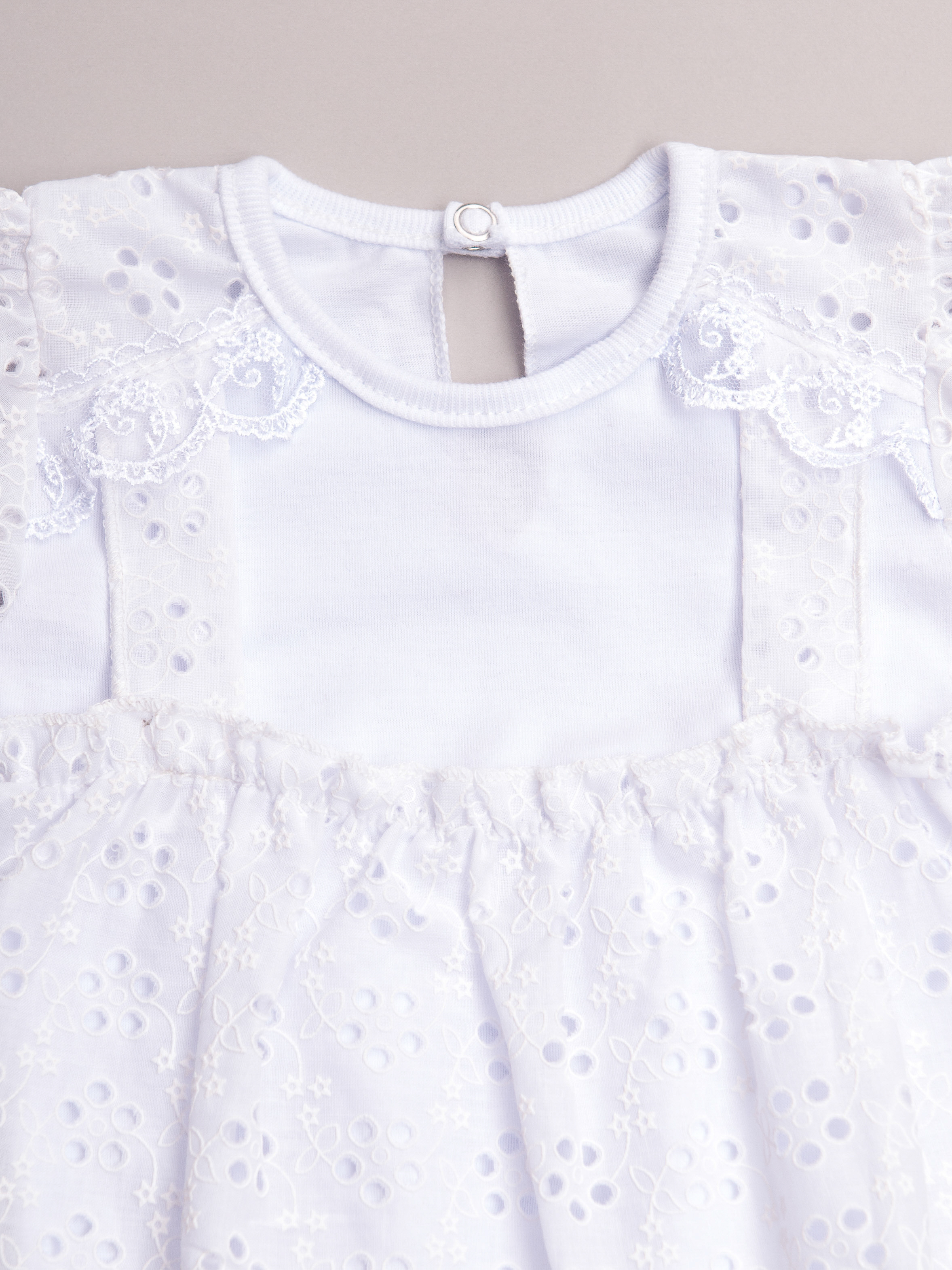 Боди платье для девочек на кнопках сшито из тонкого трикотажа 100 % хлопок высшего сорта "Пенье". Нежное хлопковое шитье, актуальное в этом сезоне, очень украшает модель. Боди для девочек выглядит модно и презентабельно, вместе с тем, оно комфортно. Минимизировано количество швов, сарафанчик крепится на лямочках, как самостоятельное изделие, что облегчает глажение после стирки. Застежка на кнопочки расположена на спинке и между ножек. Такой наряд уместен для торжественных случаев, таких как крещение, дни рождения и др. семейные торжества. Боди для новорожденных девочек.