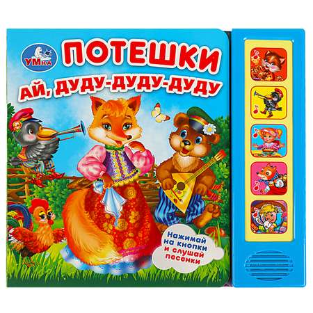 Ребёнок с удовольствием будет листать плотные страницы, рассматривать яркие картинки и, конечно, нажимать на кнопки и слушать задорные потешки. Малыш легко освоит включение звука: по нажатию на кнопку песенка включится, при втором нажатии выключится. Благодаря компактному размеру книгу удобно взять с собой в дорогу.