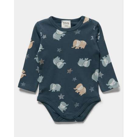 Тёмно-синее боди для мальчика Baby Go, декорированное цветным принтом со слониками.