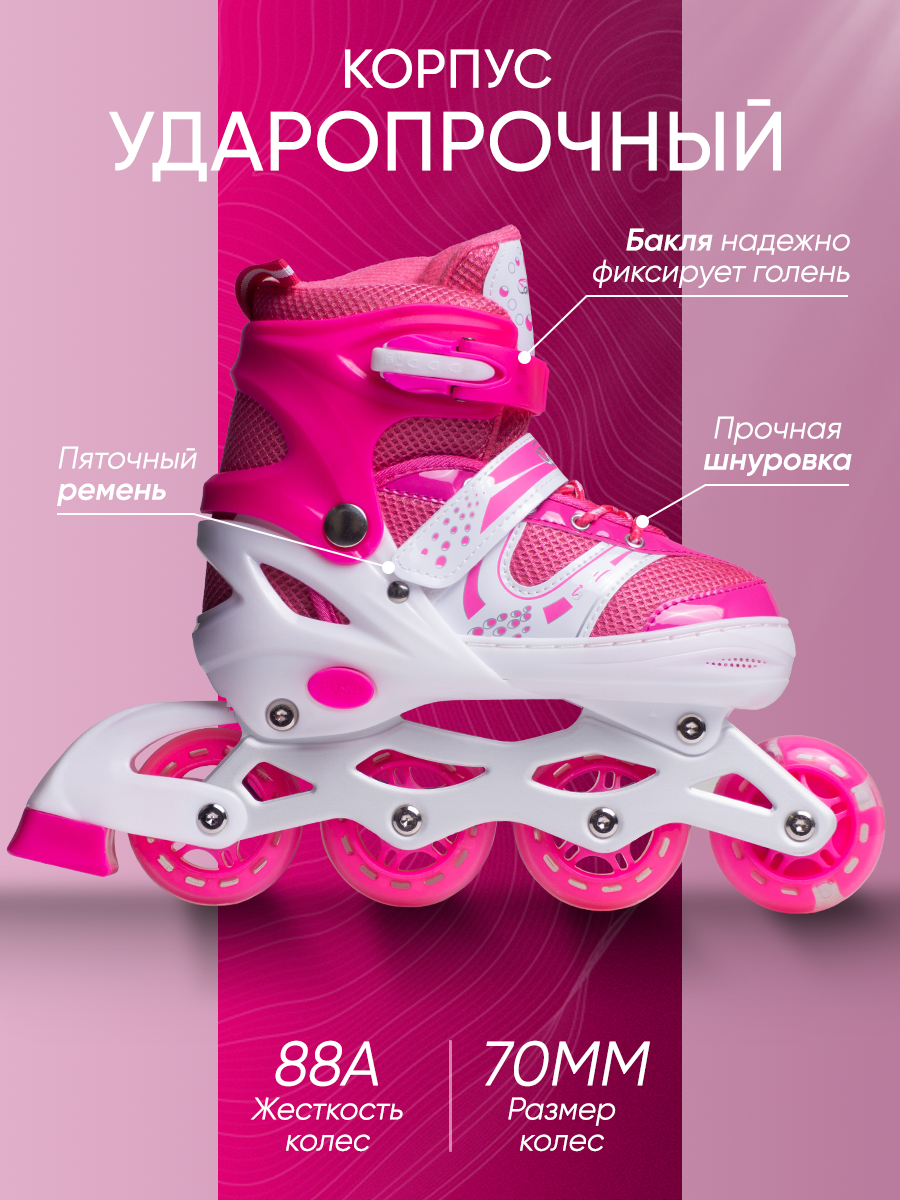 Яркие раздвижные роликовые коньки Saimaa 603PU на алюминиевой раме с четырьмя колесами изготовленными из износостойкого поливинилхлорида. Подшипники АВЕС 7 обеспечивают прекрасный накат и устойчивы к ударным нагрузкам. Первое колесо светящееся, на одном ботинке установлен тормоз, что очень важно для начинающих роллеров. Ролики плотно сидят на ноге, благодаря 3-м видам крепления: пяточный ремень, шнуровка и клипса, так же они надежно защищают голеностоп. Увеличение размера происходит плавно : для подстройки длины ботинка достаточно нажать специальную кнопку PUSH, потянуть за край и зафиксировать в нужном положении. При раздвижении ролика, размер стельки остается прежним, раздвигается сам ботинок. Наши ролики подойдут, как для начинающих роллеров, так и для тех, кто уже освоил катание на роликах. Раздвижные ролики выполнены в 4 расцветках, подойдут как для мальчиков, так и для девочек возрастом от 5 лет.