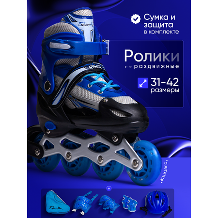 В комплект входит: ролики, наколенники, налокотники, защита для ладоней, шлем и сумка-чехол.