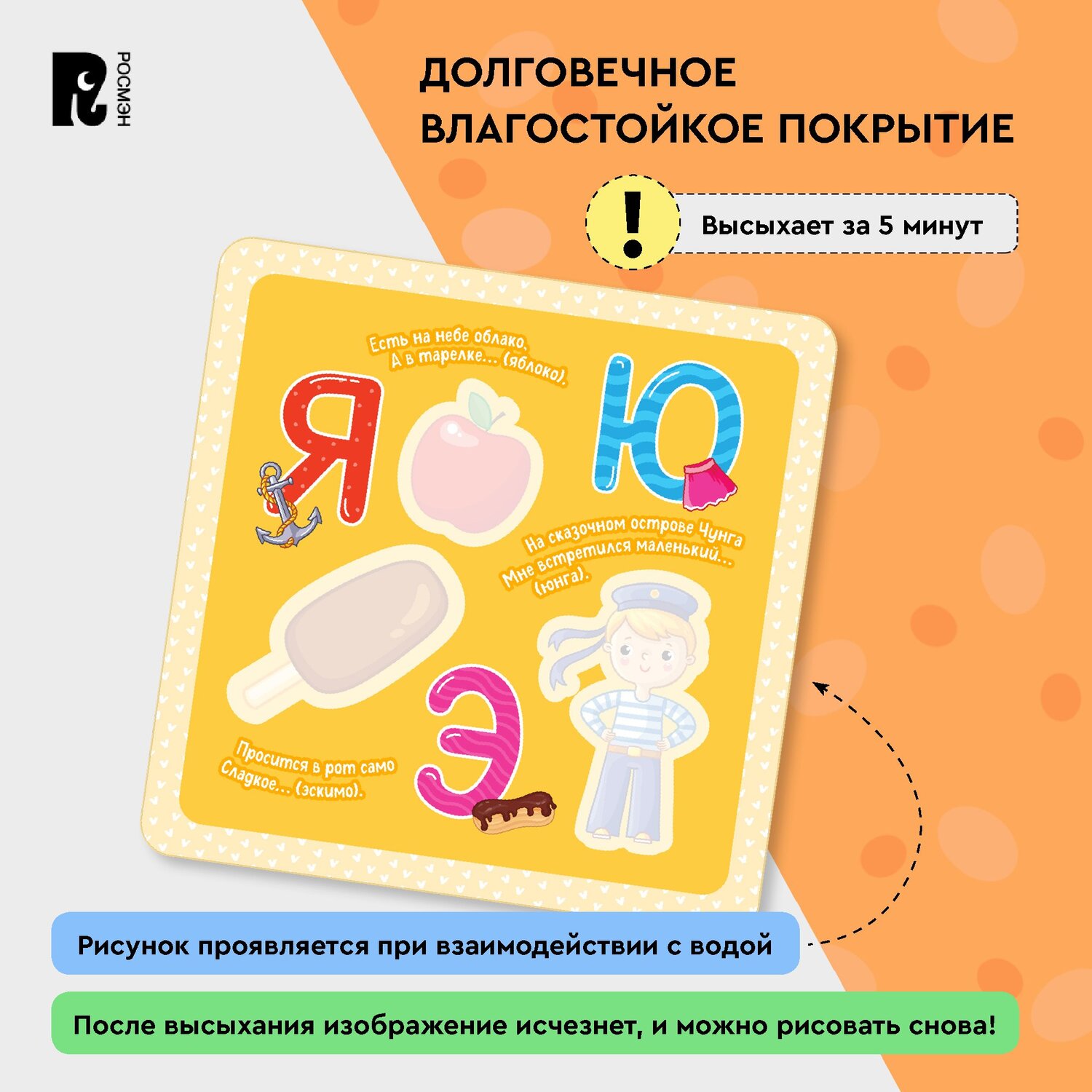 Специальное покрытие обеспечит долговечность использования, а рисунок высохнет всего за 5 минут, и можно будет раскрашивать снова.