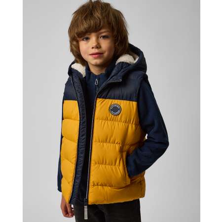 Стёганый жилет для мальчика Futurino горчичного цвета, с утеплённым капюшоном и фирменной нашивкой.