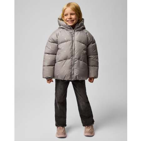 Стёганая серая куртка для девочки Futurino с блестящим цветным принтом.