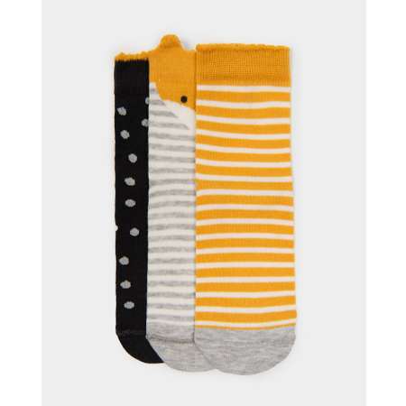 В комплекте Futurino три пары носков для девочки - горчичные в полоску, чёрные в горошек и серые с декором "лисёнок".