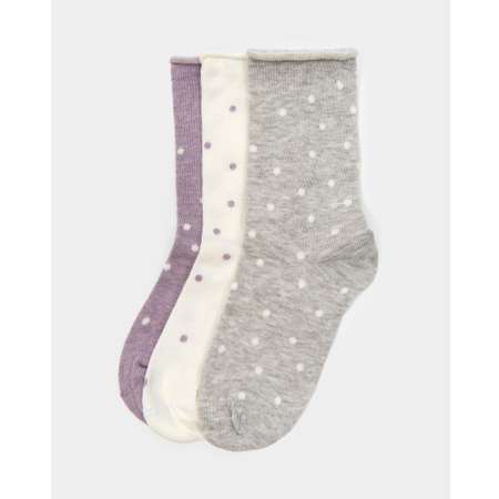 В комплекте Futurino три пары носков в горошек для девочки - сиреневые, белые и серые.