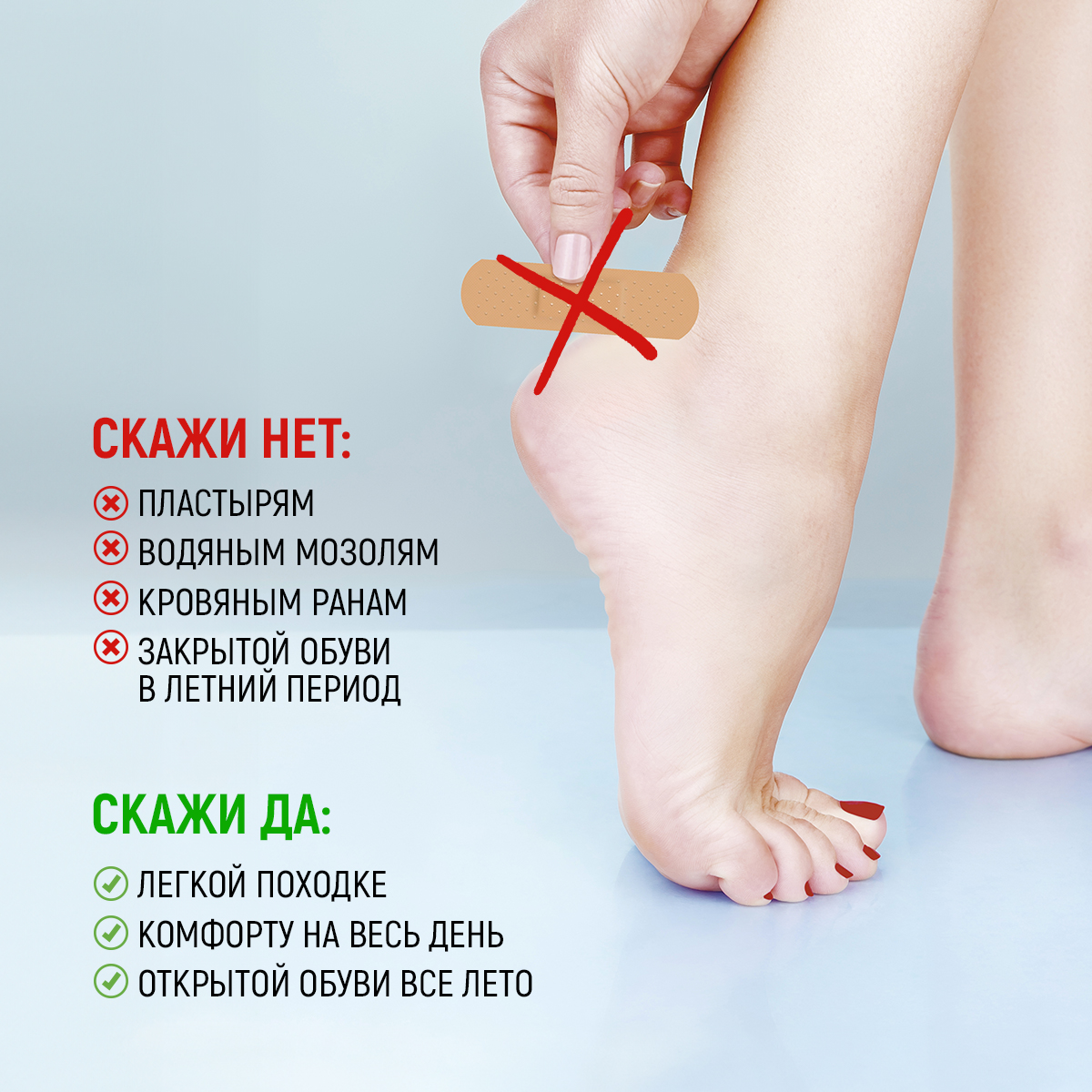 Основное действие: уменьшает трение в обуви, устраняет дискомфорт, защищает от образования мозолей.