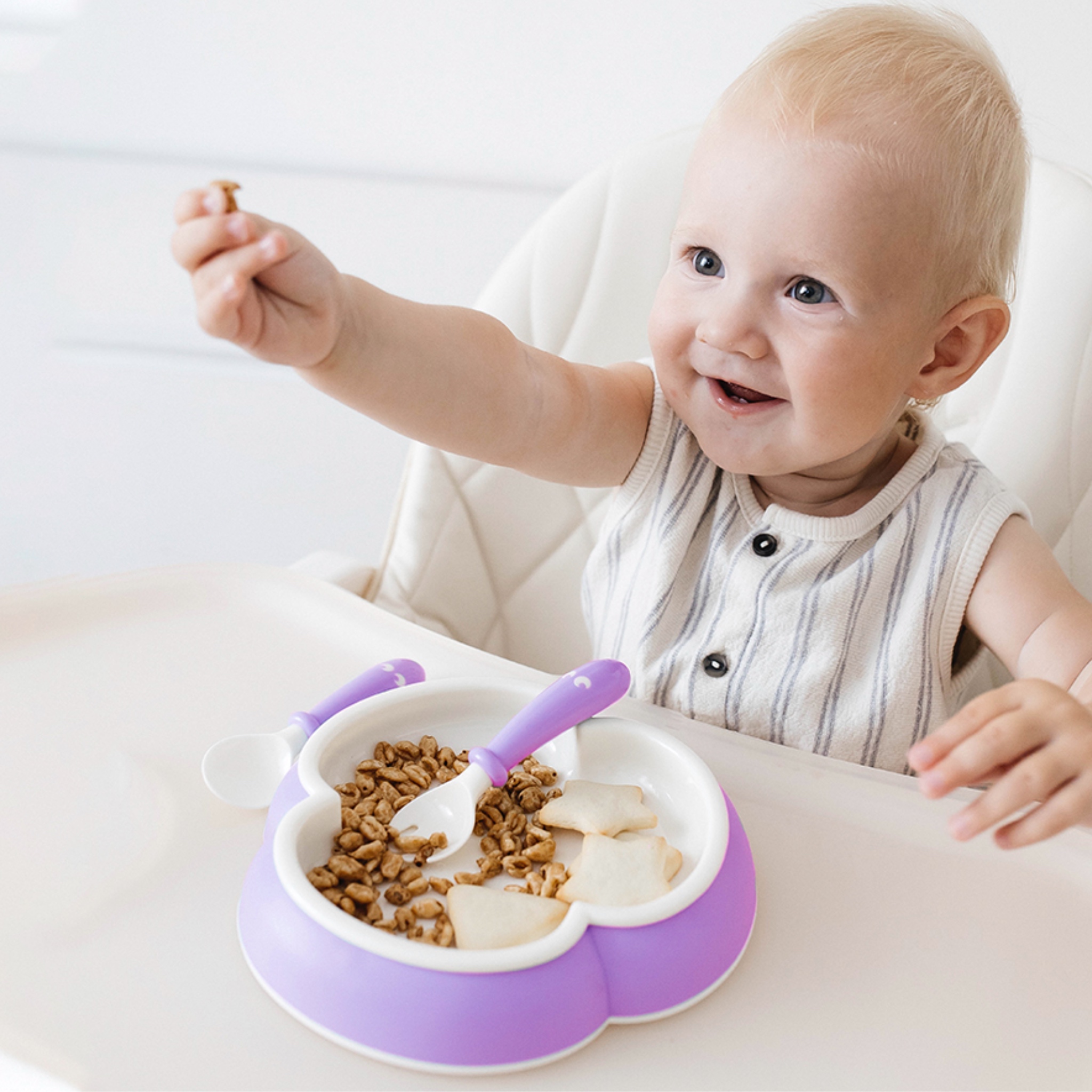 - Удобные столовые приборы с короткими и толстыми ручками, ребенку будет удобно их держать;