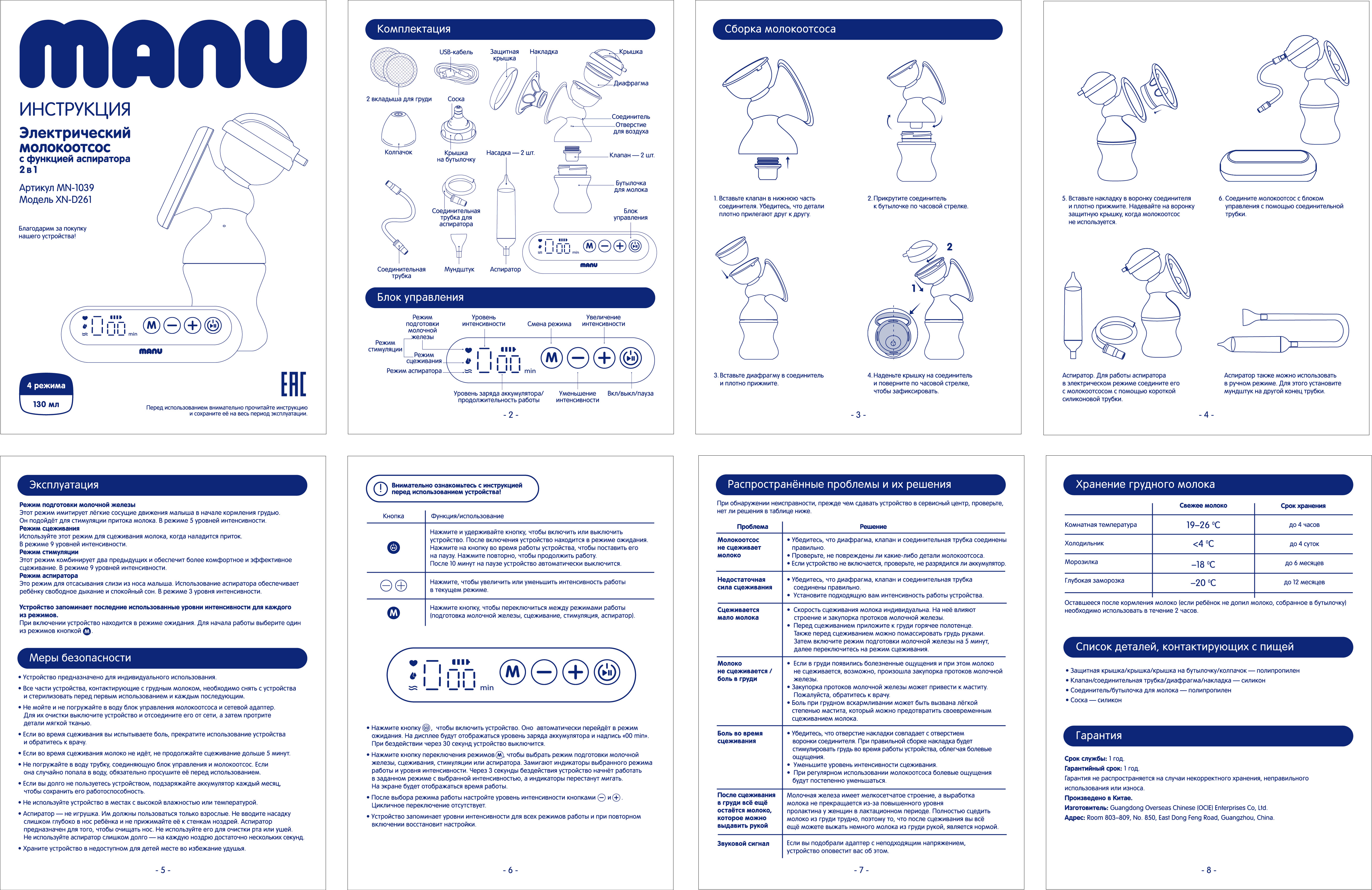 Внимание! Молокоотсос эффективен только при условии соблюдения правил сборки и эксплуатации, изложенных в инструкции (инструкция по использованию на русском языке прилагается), и тщательного ухода. Для обеспечения максимального срока службы и соблюдения требований по гигиеничности следует разбирать и мыть молокоотсос после каждого применения.