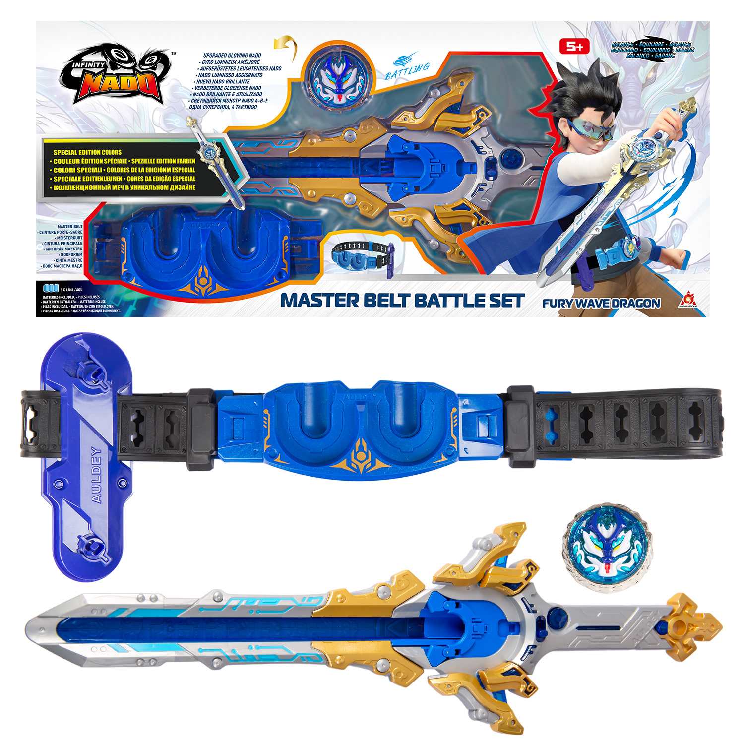 В наборе: пусковая установка меч Эпик Лончер Мастер, пояс Мастера Надо, светящийся металлический волчок, монтажный инструмент, крепления на пояс, инструкция, 3 батарейки LR41/AG3 (напряжение 1,5V), входят в комплект.