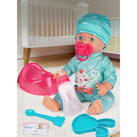 В комплект входит набор аксессуаров: горшок, пустышка (соска), бутылочка, свидетельство о рождении.
