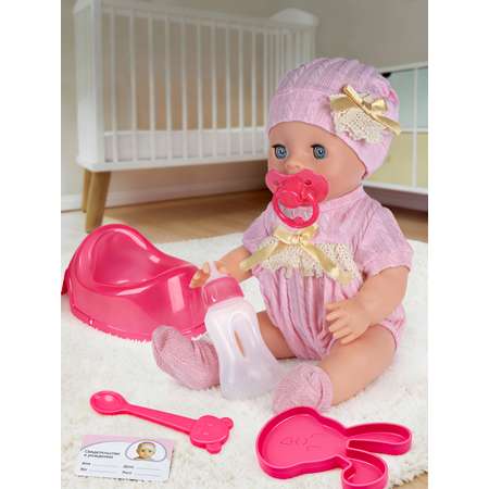 В комплект входит набор аксессуаров: горшок, пустышка (соска), бутылочка, свидетельство о рождении
